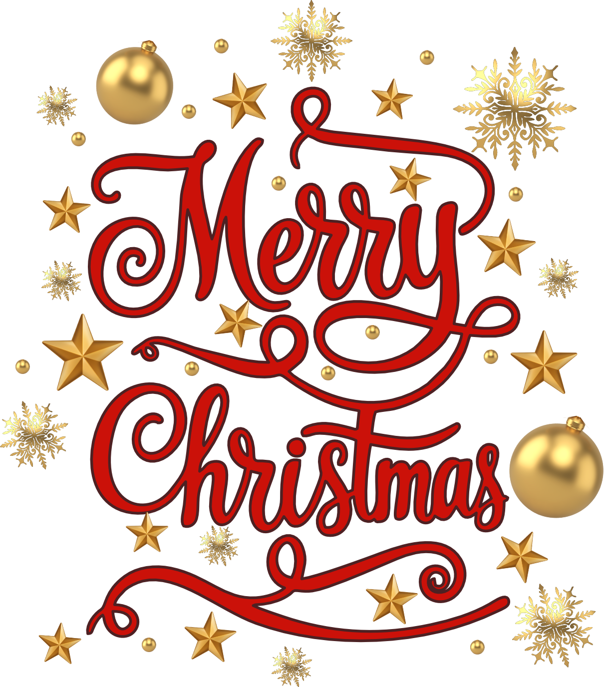 Ornaments: The text is surrounded by a variety of 3D-rendered Christmas decorations, including: