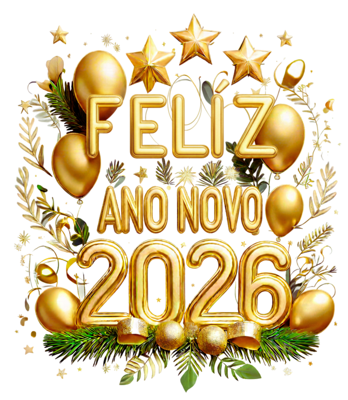 Texto Central: Em destaque, lê-se “FELIZ ANO NOVO 2026”. As letras e os números possuem um efeito 3D metálico e brilhante, como se fossem feitos de ouro polido ou balões metalizados.